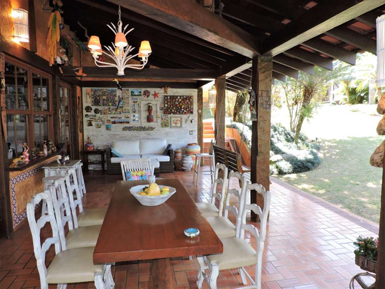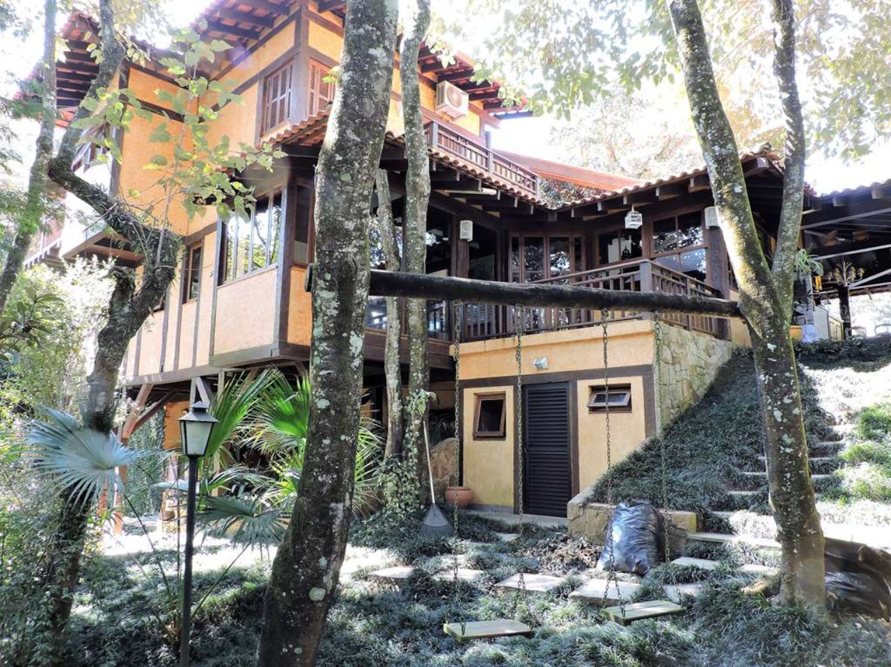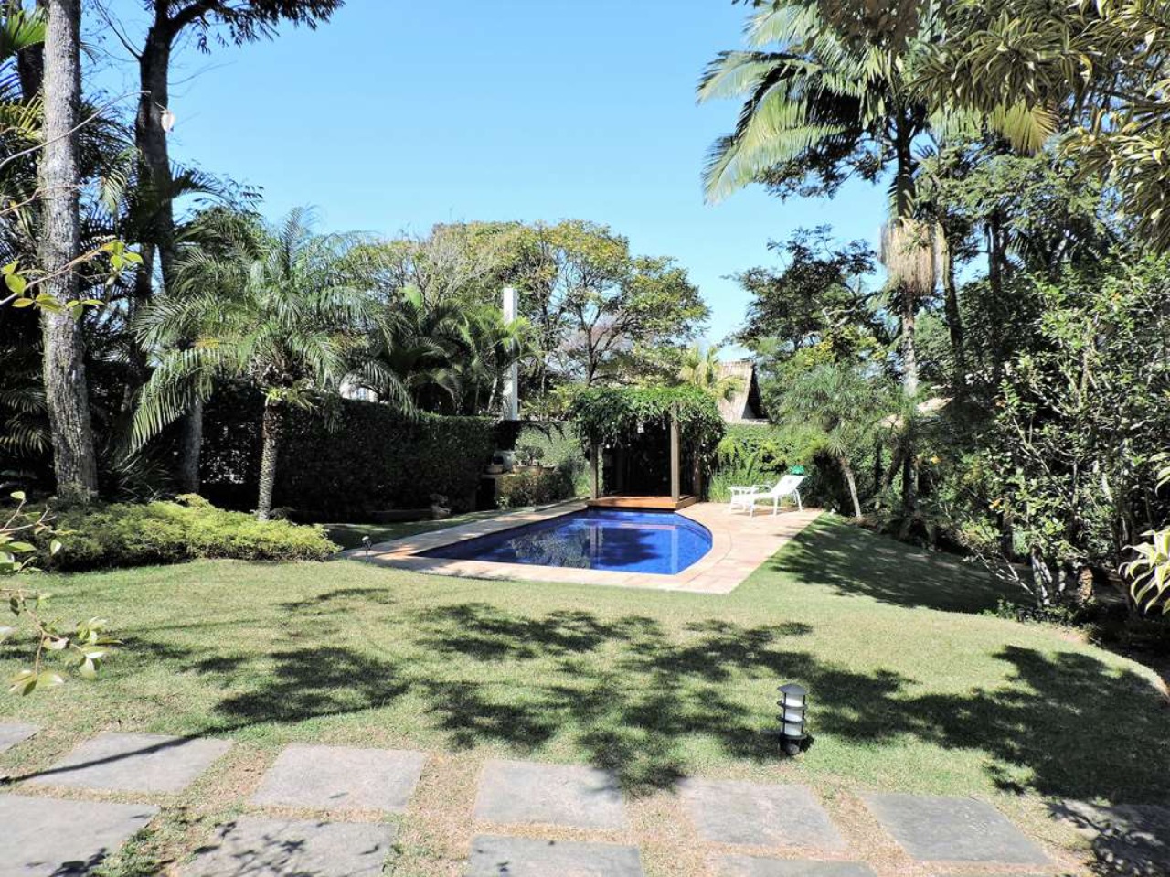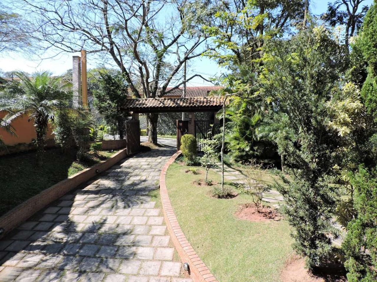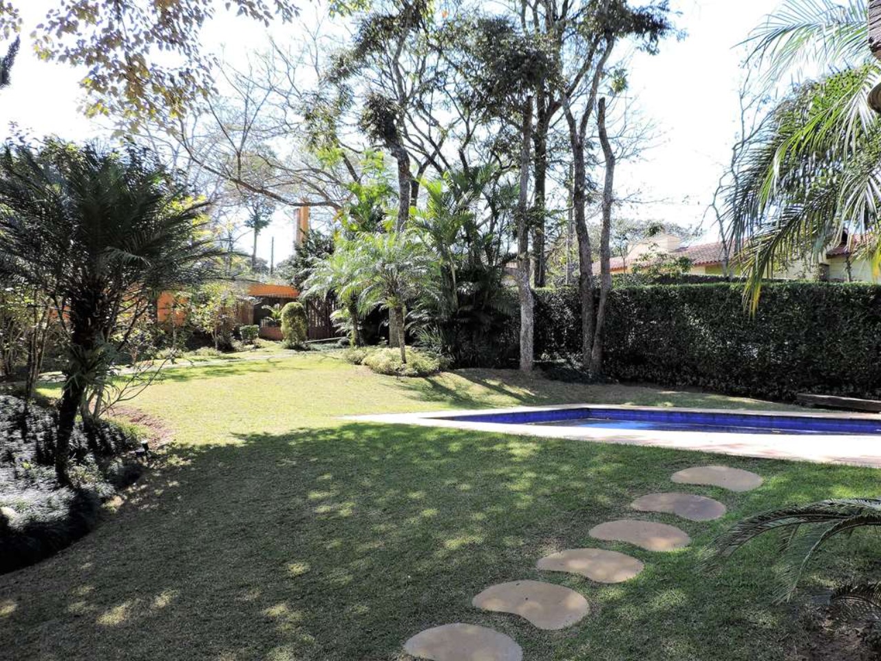 Ótima localização em final de rua, com muita natureza e privacidade. Excelente casa integrada em estilo rústico e ótimo acabamento. Projeto da Arquiteta Sandra Sayeg Tranchesi. Projetos de iluminação e paisagismo. Imóvel repleto de armários, com madeiramento em maçaranduba, pisos de tábuas largas em Camaçari , tijolos, ladrilho hidráulico e cerâmica. Hall de entrada social pelo piso intermediário, com jardim interno, claraboia e lavabo. Dando acesso ao living por meios lances de escada (para baixo), e à área íntima (para cima). Living envidraçado com pé direito alto, para 4 ambientes: salas de jantar e estar que dividem a lareira, sala de TV e escritório. Ótima varanda em ?L? com espaço gourmet, churrasqueira, ilha com bancada, pia e armários, voltada para piscina e jardins. Piscina de alvenaria, aquecida e iluminada, com prainha, hidro, gazebo, solaruim e ducha. Banheiros com espelhos, gabinetes, box de vidro e tampos em mármore, sendo a máster com 2 cubas e hidro. Copa cozinha americana com ilha e armários planejados, fogão, cooktop, coifa e despensa. Área de serviço aberta e fechada, com 2 tanques e armário planejado. Dependências de empregada totalmente independente, sob a varanda. Pode ser convertido em escritório, ateliê, studio, etc. Portão Automático. Aquecimento central de água: Boiler elétrico. Abastecimento de água: Sabesp e poço artesiano.  REF:CA01351